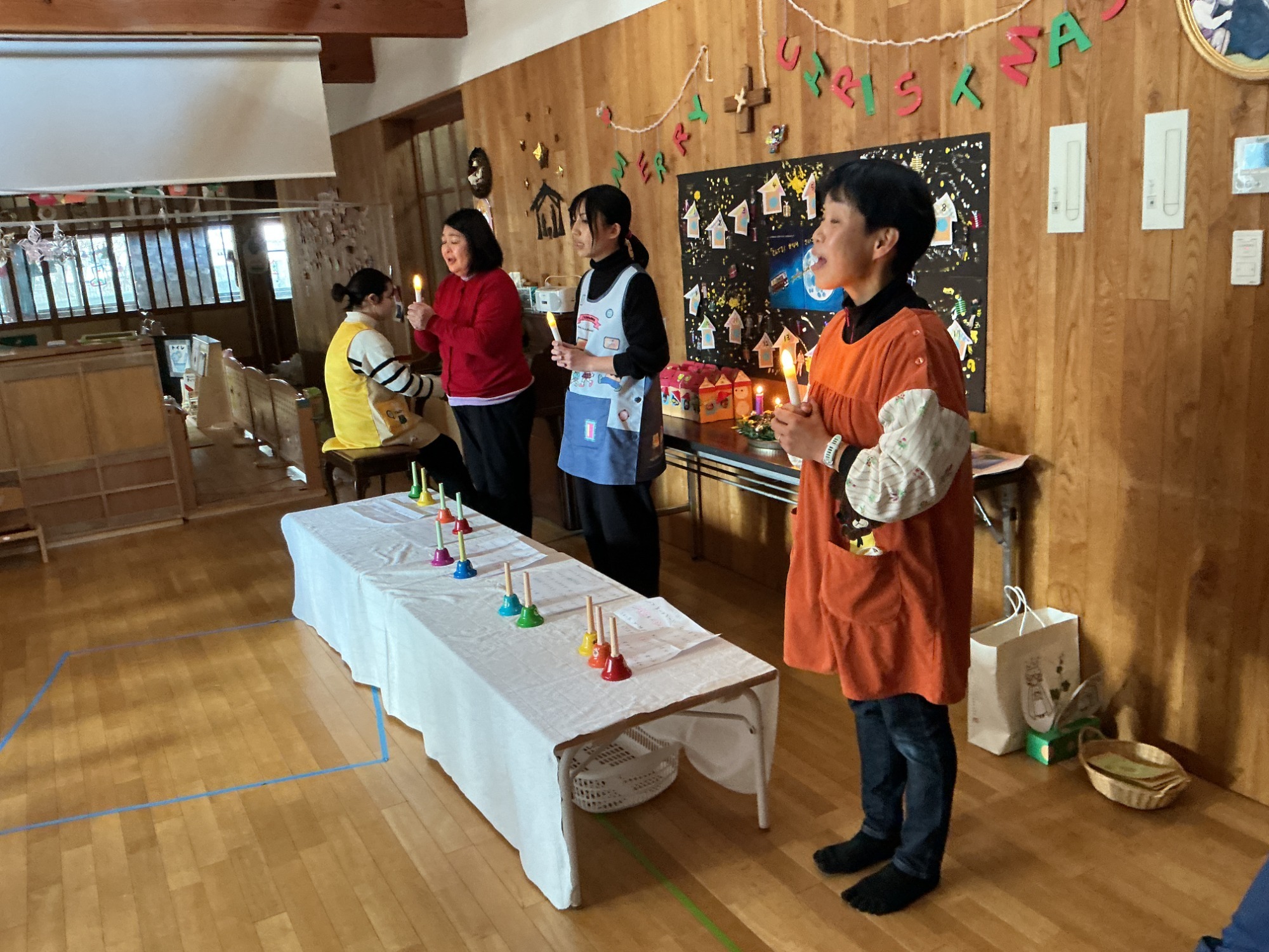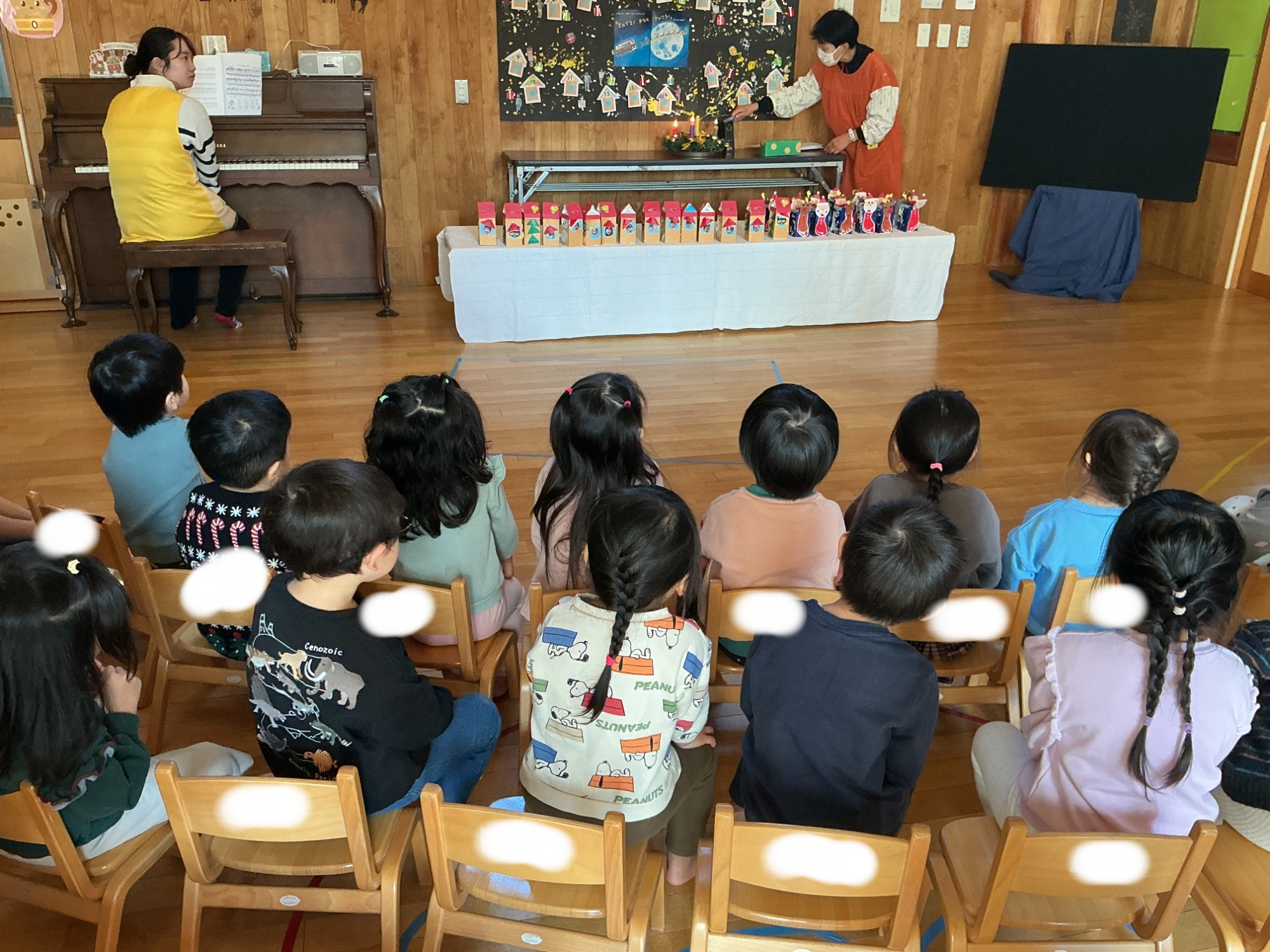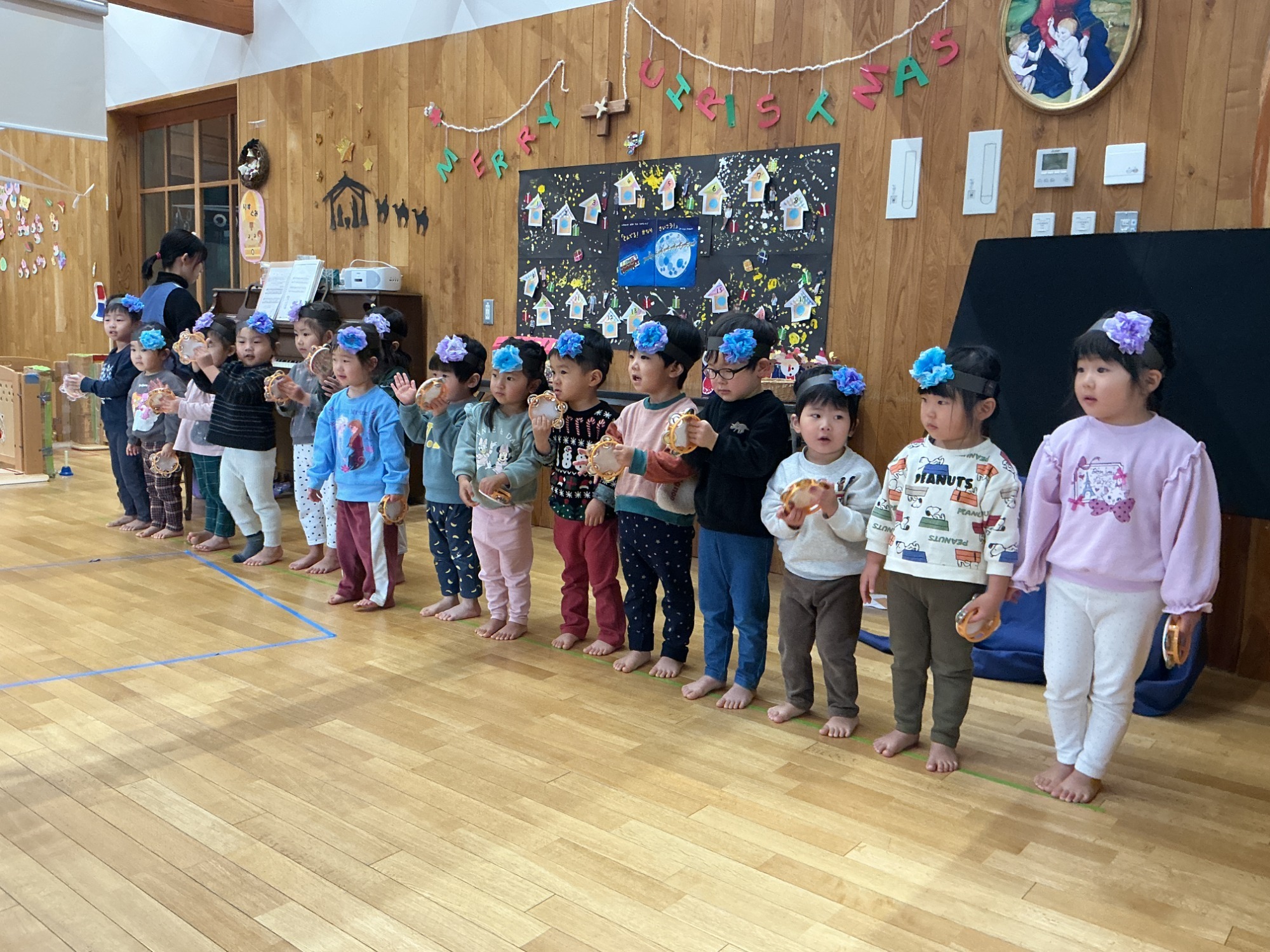 ひつじかい、ひつじ、てんし、ほしたちがイエスさまのお誕生をお祝いしてくれました。好きな楽器を選び『もみの木かざろう』を演奏した年中さん。イエスさまに届いたかな!(年中)