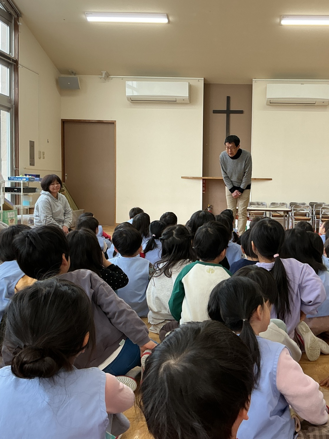 神様やお家の方、たくさんの方々に見守られながらここまで大きくなったことに感謝しました。田中チャプレンに「神様の恵みによって心も体もすくすくと大きくなりますように」とお祈りして頂きました。園長先生から折り紙のお祝いも頂いたね。