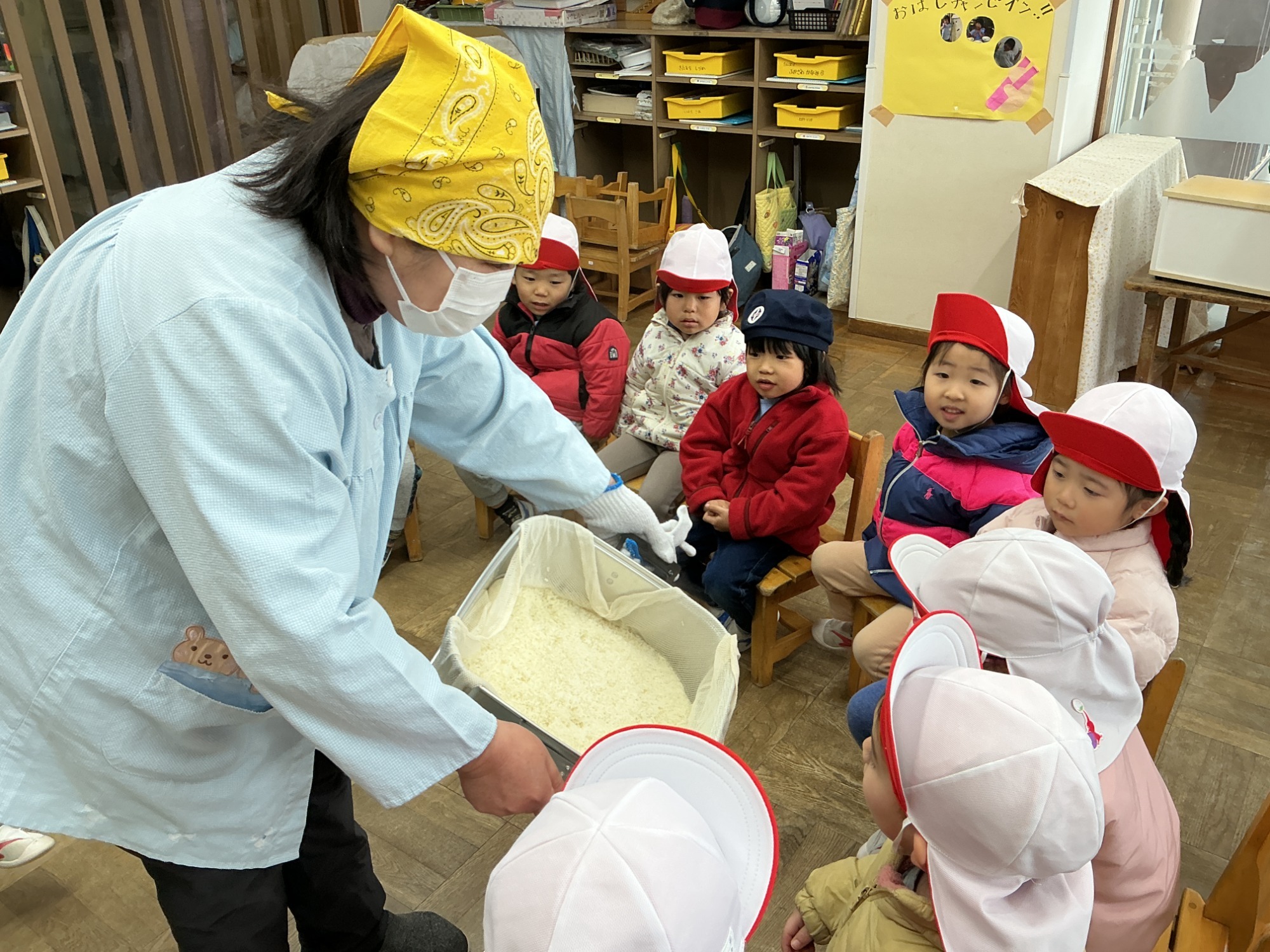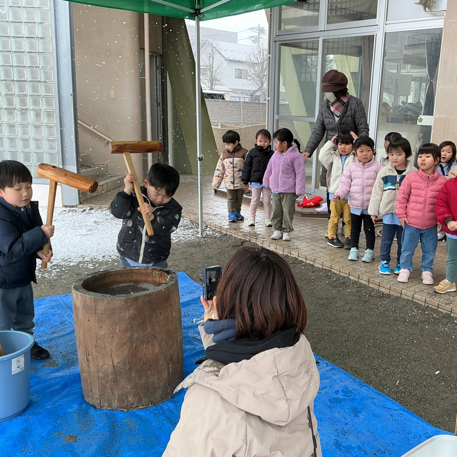 3学期はおもちつきの行事でスタートしました。炊き立てのもち米を見たり、もち米の香りを嗅いだりすると「美味しそう!」と子どもたちは大喜び。サプライズで雪が舞う寒い日でしたが「よいしょ!よいしょ!」の子どもたちの熱い掛け声で熱気あふれたおもちつきになりました。今日のおもちはあられにしていただく予定です。