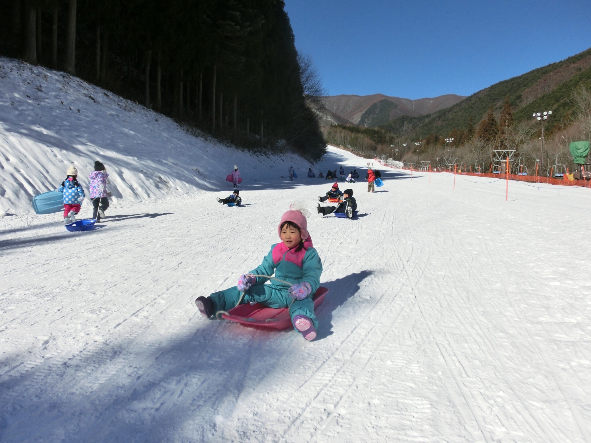 あさひプライムスキー場にそりあそびに行ってきました。スキー場に近づくにつれ雪が見え、着いた時には「わー!」と歓声が上がりました。「いっしょにすべろう」とお友だちや先生と一緒にそりに乗ったり、「きょうそうしよう」と競争しているお友だちも!お昼はカレーを食べておなかいっぱい。たくさん滑って楽しかったね!